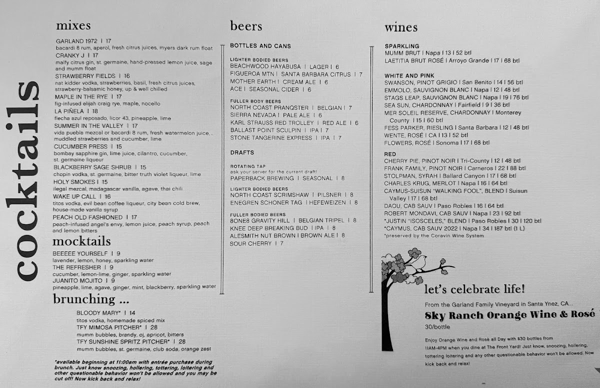 Discover a dining experience like no other at The Front Yard, where delicious flavors and charming ambiance come together seamlessly. Nestled beside the esteemed Garland Hotel, this delightful eatery enchants both local patrons and visitors alike with its inviting outdoor patio adorned with lush greenery, striking decor, and the warm glow of an outdoor fireplace.
